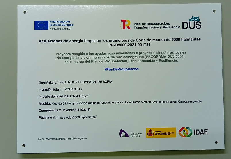 Proyecto: | La Diputación provincial de Soria es beneficiaria de una subvención de 1.547.625,65 euros (para una inversión total de 2.346.050,03 euros) dentro de la convocatoria de ayudas para inversiones a proyectos singulares locales de energía limpia en municipios de reto demográfico (PROGRAMA DUS 5000) en el marco del Programa de Regeneración y Reto Demográfico del Plan de Recuperación, Transformación y Resiliencia que regula la financiación de la Unión Europea a través de los fondos NEXT GENERATION. El objetivo de esta subvención, regulada por el Real Decreto 692/2021, es la ejecución de acciones dirigidas bien a la renovación, instalación y/o sustitución de instalaciones de alumbrado exterior, placas fotovoltaicas o calderas por bombas de calor de aerotermia en 19 municipios de la provincia de Soria para obtener un ahorro en el consumo y la eficiencia de la energía consumida. Los municipios en los que se van a llevar a cabo las inversiones son: Rioseco de Soria Espeja de San Marcelino Langa de Duero Ucero Matalebreras Pinilla del Campo Almenar de Soria Medinaceli Garray La Póveda Alcubilla de Avellaneda Espejón Fuentearmegil Santa María de las Hoyas Valdelagua del Cerro Valdemaluque Golmayo Entre las actuaciones que se llevarán a cabo se incluyen instalaciones fotovoltaicas en el bombeo de elevación de aguas; así como instalación fotovoltaica y aerotermia en diferentes edificios municipales. |